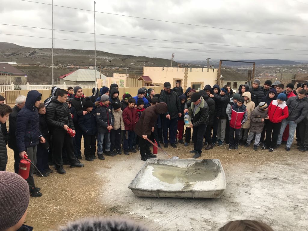 Был объявлен общий сбор. В проведении данного занятия приняли участие все сотрудники и воспитанники школы совместно с подразделениями федеральной противопожарной службы МЧС по Республике Дагестан, ПСУ – 12, караул № 3 отделения №2 в составе 4 – х человек. Пом. Начальника караула Абутамов И. С., пожарники: Герейханов М. Б., Тагиров Н. Г., Насрулаев К. И. Была проведена отработка системы оповещения. В 15 часов 15 минут сотрудники МЧС создали учебный очаг возгорания на открытой территории. Ими была проведена отработка тушения очага возгорания с применением 3 видов средств пожаротушения: огнетушители порошковые, пенообразователи и сухотрубы. Инструктор по безопасности и жизнедеятельности Нажмудинов М. Б. разъяснил всем присутствующим правила поведения при пожаре. Он также продемонстрировал всем присутствующим, как необходимо обращаться с пенными и порошковыми огнетушителями, имеющимися в наличии школы. Показал, каким образом работают сухотрубы. После основной части запланированного занятия по основам организации тушения пожаров и изучению основ пожарной безопасности состоялась встреча воспитанников школы с сотрудниками МЧС. Пом. Начальник караула Абутамов И. С. объяснил всем присутствующим, что социальные объекты такие как школы, детские сады, больницы являются наиболее важными и уязвимыми в плане пожарной безопасности. Соблюдение правил пожарной безопасности для администрации и сотрудников этих учреждений должно быть приоритетным. Ребята задавали следующие вопросы пожарникам: - «Каковы основные причины пожаров в настоящее время в Буйнакском районе?». Абутамов И. С. ответил, что наиболее частая причина пожаров - это несоблюдение правил безопасности при использовании газового и электрического оборудования в быту и на производстве. Также часто причиной отравления угарным газом в частных домах и квартирах становятся последствия работы установленных в них некачественных газовых каминов. На вопрос, «Улучшается или наоборот ухудшается ситуация в районе с пожарной безопасностью», наши гости однозначно ответили, что ситуация улучшается. Благодаря тому, что государство уделяет больше внимания этому вопросу, возросла информированность граждан, значительно улучшилась материально – техническая база противопожарной службы МЧС.